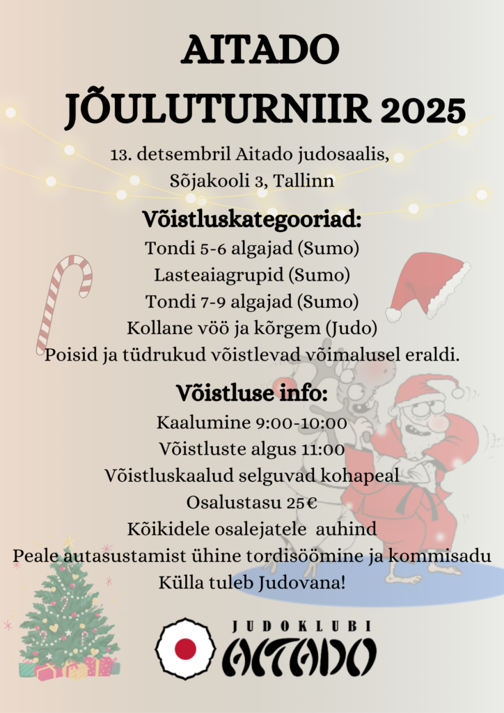 JÕULUTURNIIR Võistleja eesnimi *Võistleja perekonnanimi *Võistleja sünniaasta *Võistlusgrupp *Tondi 5-6 aastased algajad (sumo)Lasteaia grupid (sumo)7-9 aastased algajad (sumo)Kollane vöö ja kõrgem (judo)Treeninggrupp *Alasniidu lasteaedAsunduse lasteaedEndla lasteaedHarku lasteaedKasekese lasteaedKelmiküla lasteaedKolde lasteaedLauliku lasteaedMänni lasteaedMursaste koolPäikesejänku lasteaedRõõmutarekese lasteaedSaueTabasalu Tibutare lasteaedTondi 5-6 aastased algajadTondi 7-9 aastased algajadTondi kollased vöödTondi edasijõudnudTondi kollased-oranžid ja oranžid vöödMuuNameRegistreeru turniirile